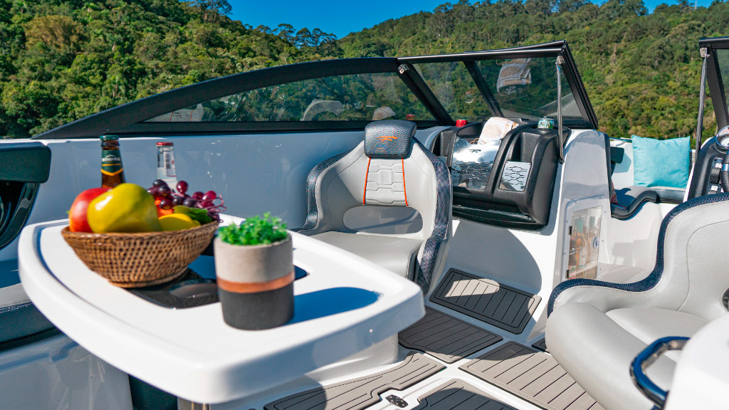 Console de som com porta copos e iluminação indireta – dois na proa e dois na popa;