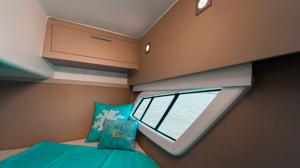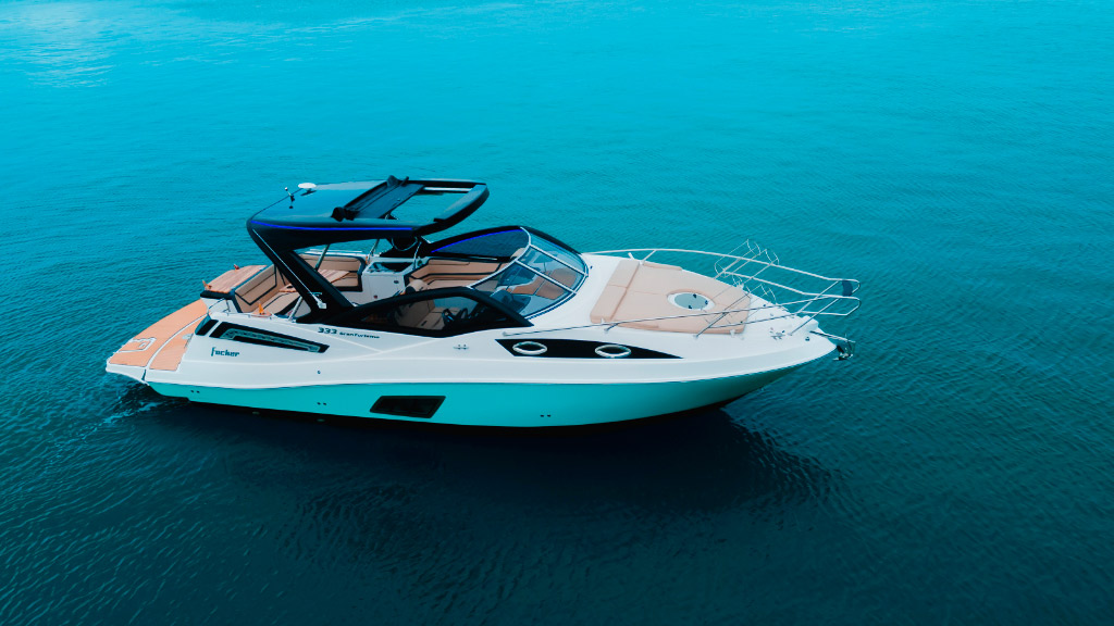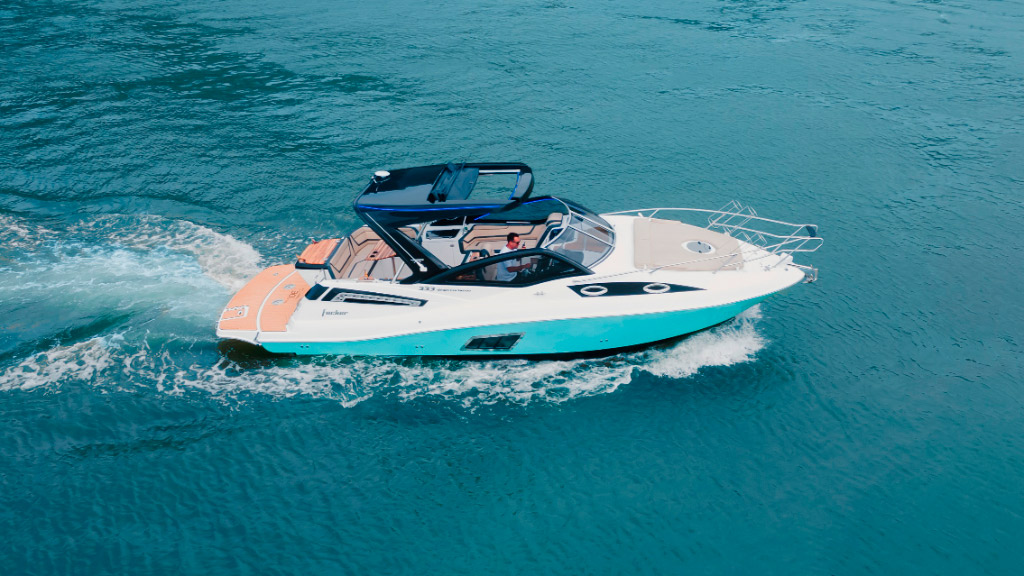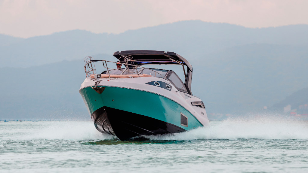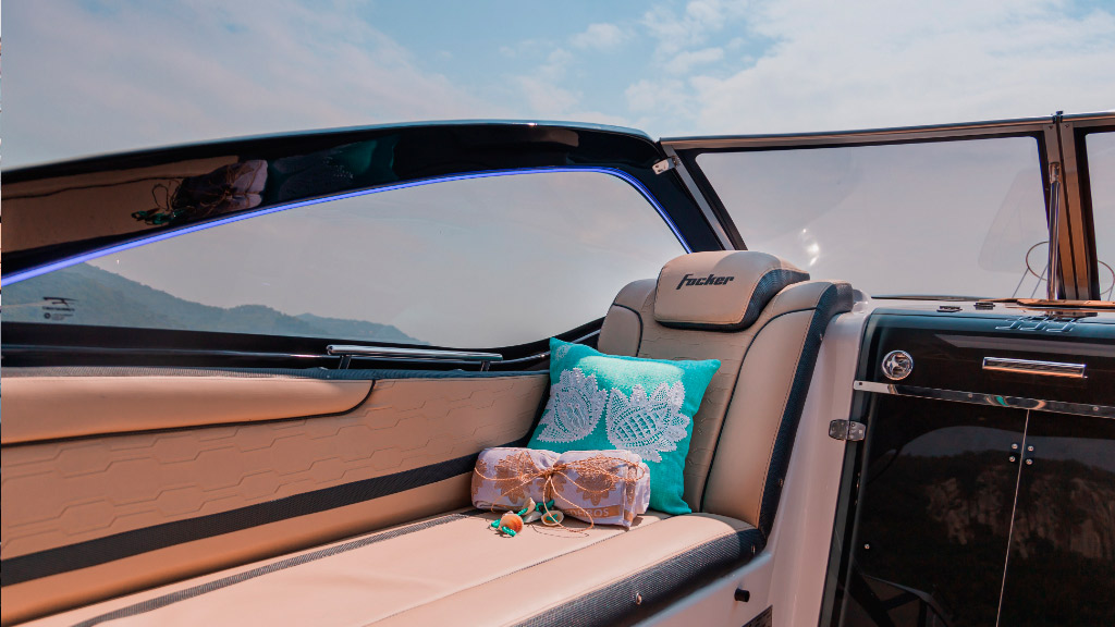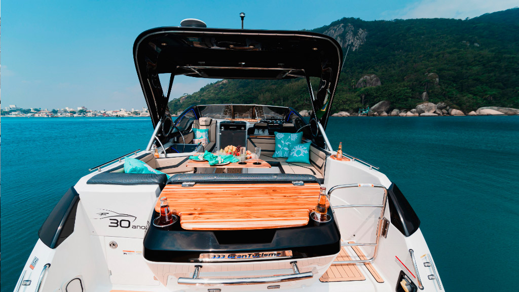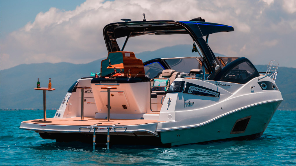 A Focker 333 Gran Turismo, edição comemorativa de 30 anos do estaleiro, é marcada pelo design imponente e esportivo, trazendo um acabamento exclusiva em led.
